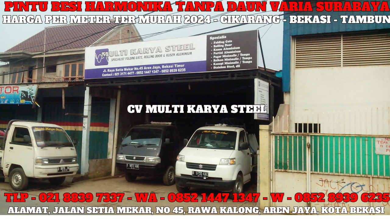 CV.Multikaryasteel Supplier produk Pintu Harmonika Pintu Folding Gate dan rolling door Slat Daun Besi Galvalum dan Aluminium ykk Harga Murah untuk wilayah kab Cikarang kota Bekasi, tambun, cibitung, kranji, Jakarta pusat, jakarta barat, jakarta timur, jakarta selatan, jakarta utara, kota jakarta, monas, senayan, semanggi, tebet, manggarai, grogol, ancol, pluit, serpong, tangerang, depok, bintaro, alamsutra, kelapa gading, cengkareng, cilamaya, bandung, bogor, cileunyi, cibinong, cibubur, cimanggis, cisalak, cinere, ciputat, karawang, cikampek, purwakarta, subang, cirebon, ciledug, tambun, setu, cibitung, cabang bungin, sukatani, kebonkopi, muara gembong, sukawangi, babelan, tarumajaya, tambun utara, gabus, suka karya, tambelang, pabayuran, karang bahagia, tambun selatan, cikarang barat, kedungwaringin, serang baru, bojong mangu, cibarusah, lippo cikarang, cikarang baru, jababeka. WHATS APP KLIK DISINI.